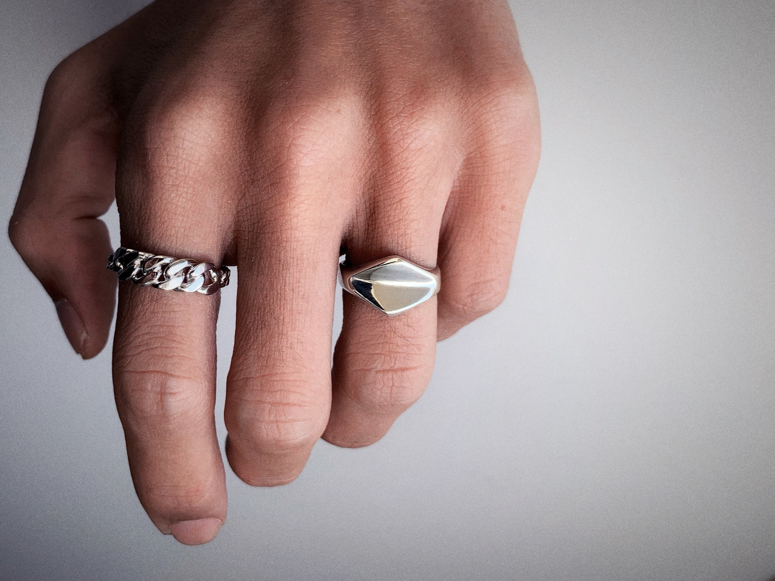 太さの異なるKIHEI型チェーンで構成されたリングはゴージャス感とラグジュアリー感を兼ね備え、様々なスタイルにマッチします。