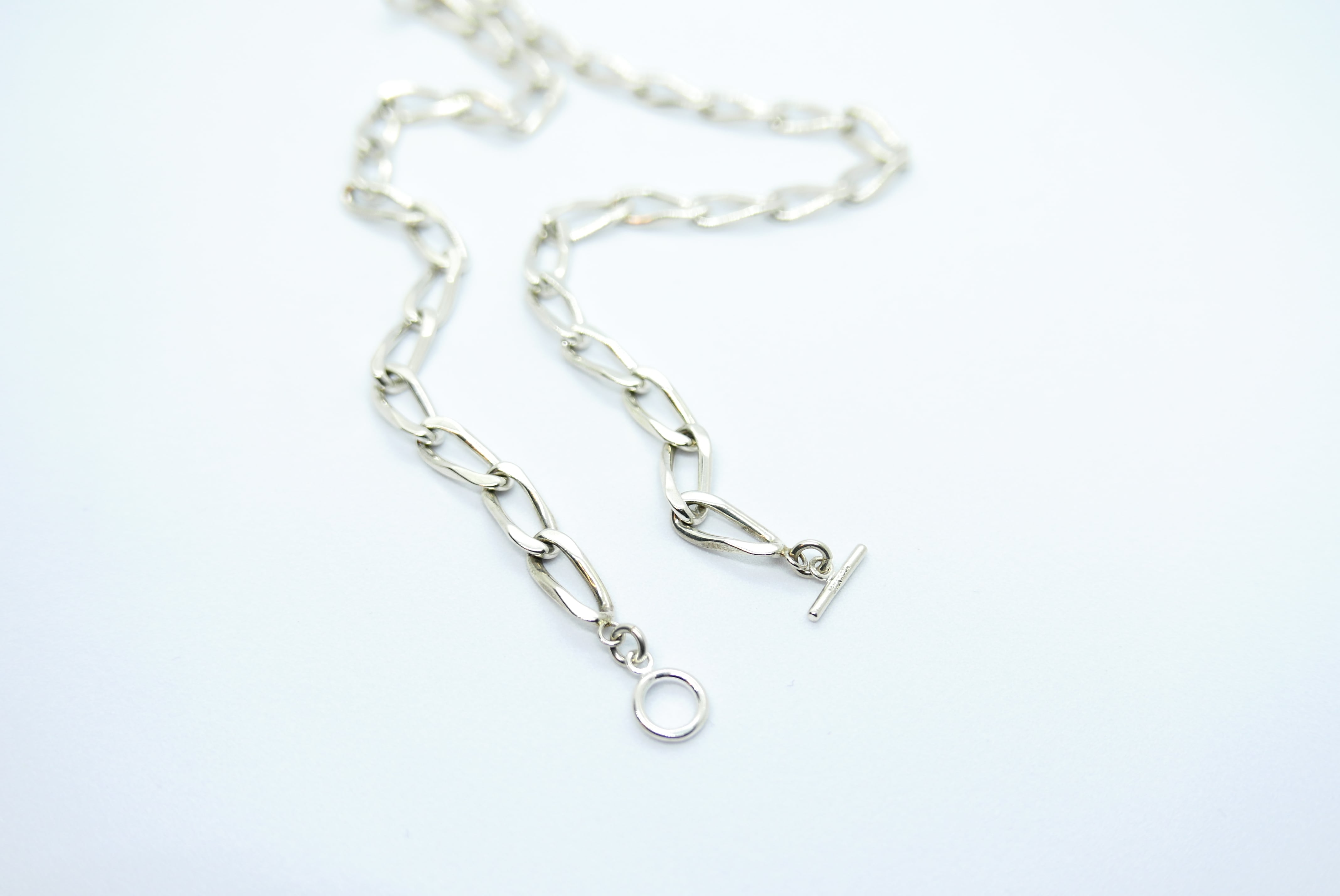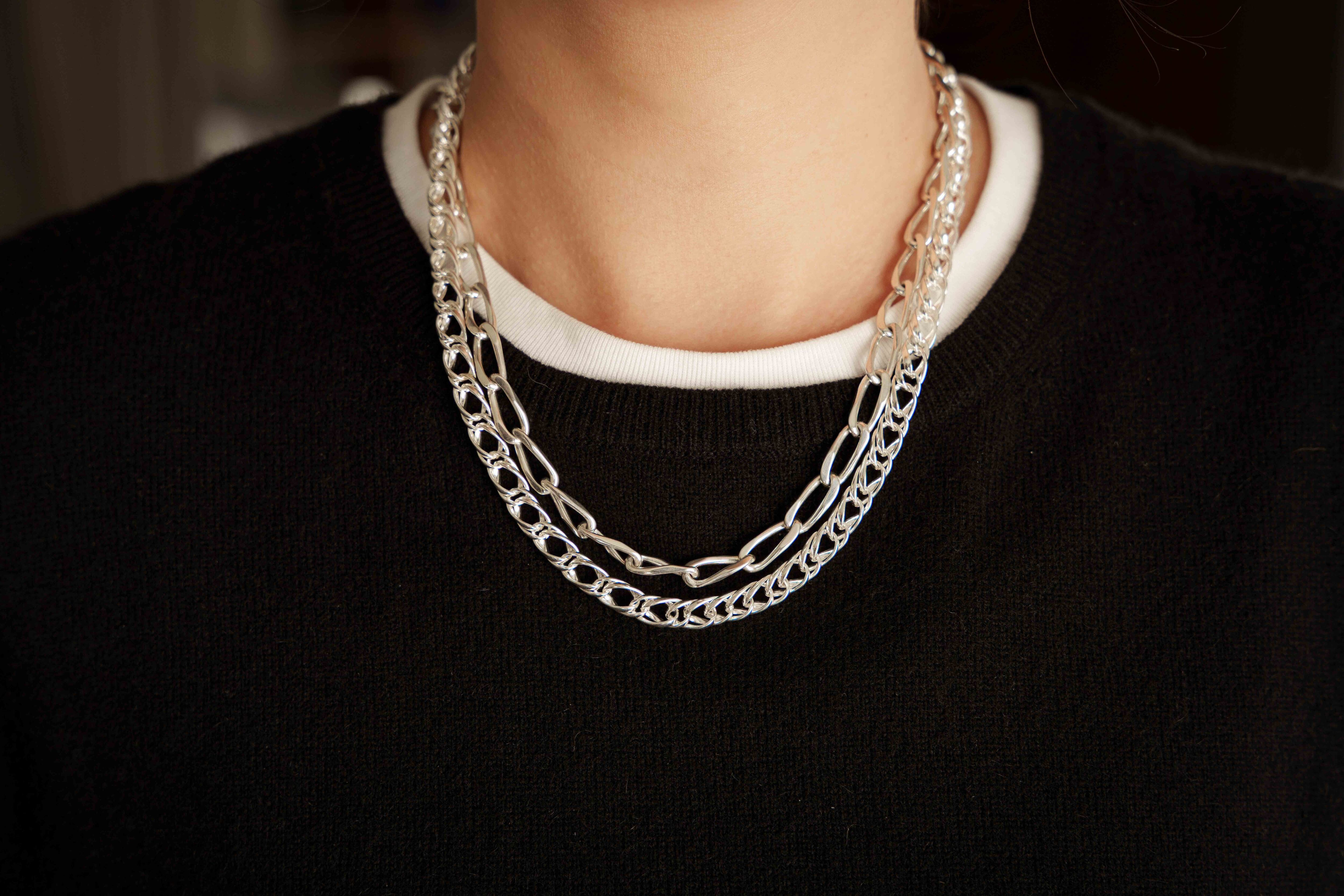 “落ちる”ように描かれるラインが印象的なチェーンネックレス。