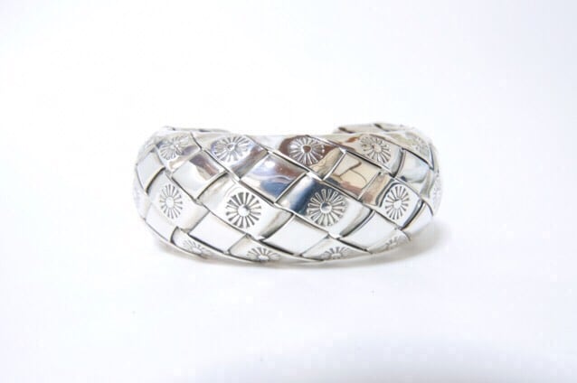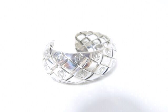 メキシコ/タスコの国産銀を使用し、ハンドカットされた重量感のあるシルバーを一つ一つ手作業で編み込み、丁寧で力強いスタンプが施され、存在感ある仕上がりになっております。