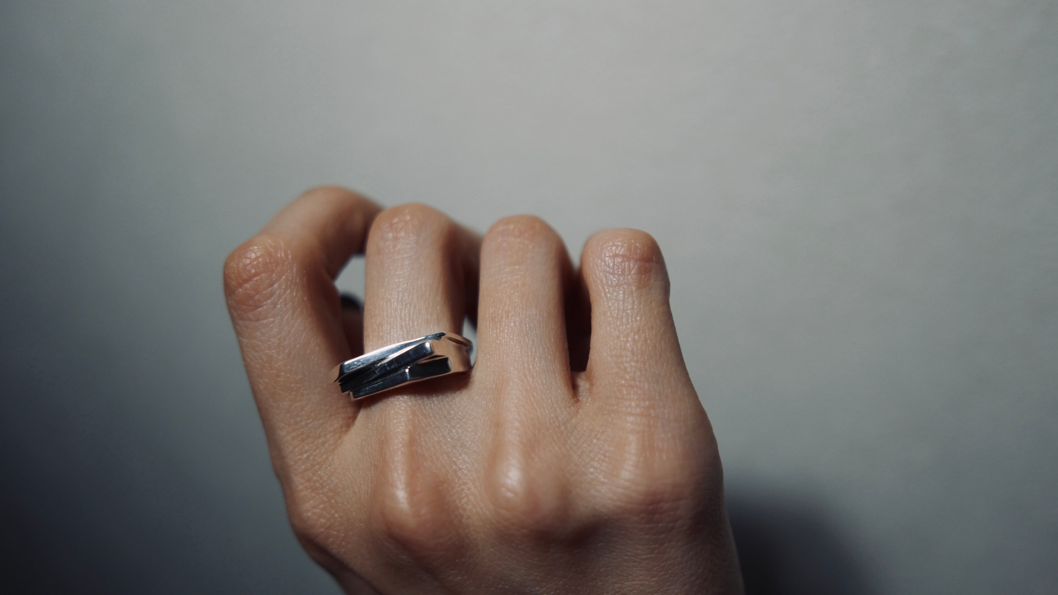 ・それぞれ形の違う三本のringをランダムに重ねたデザイン。