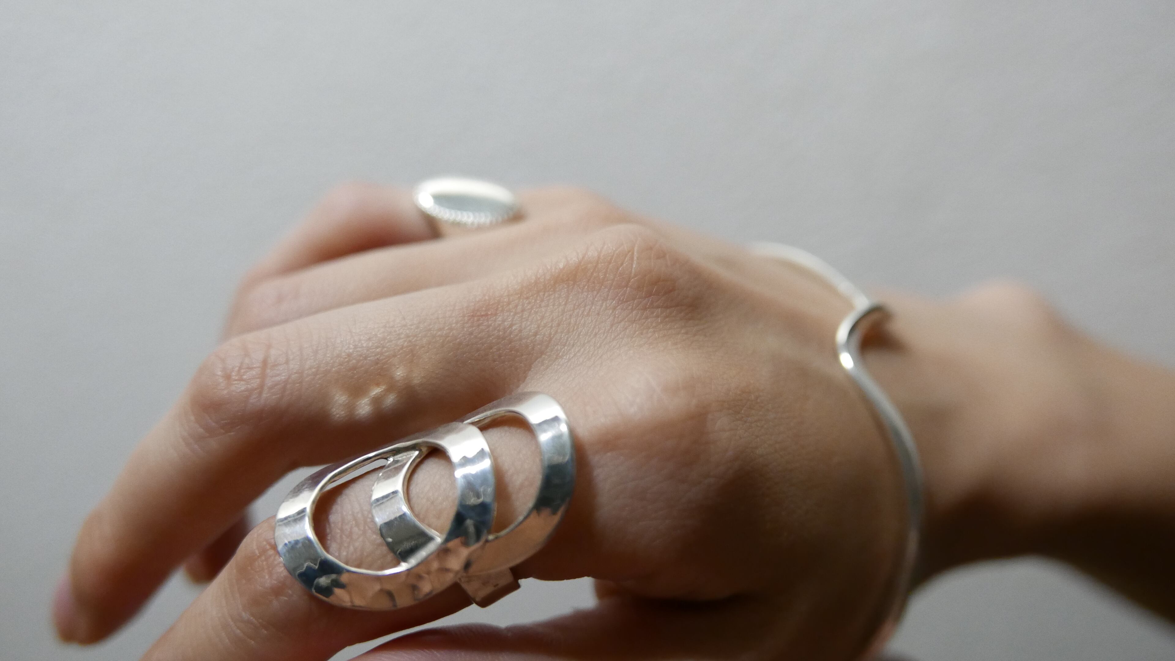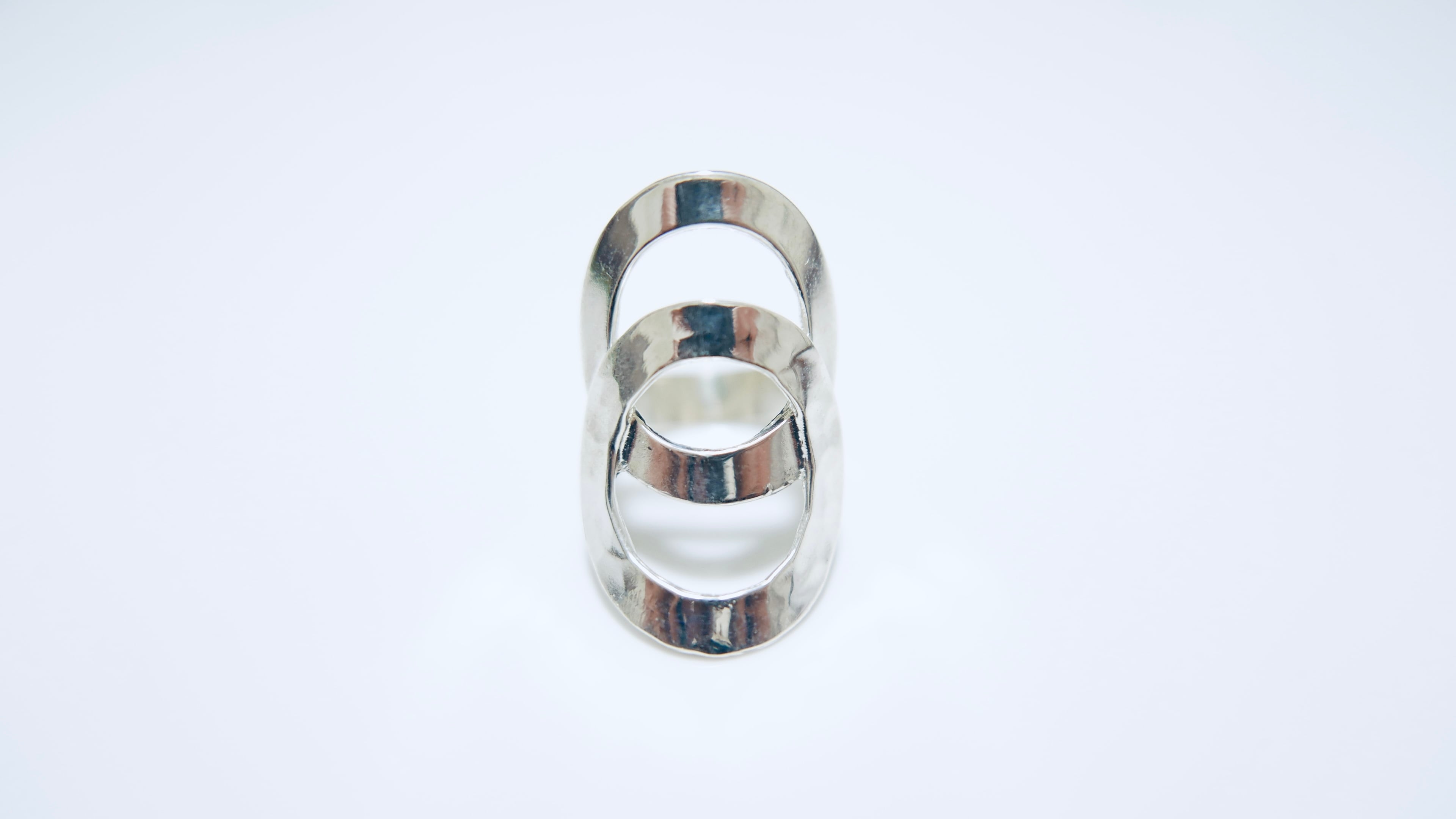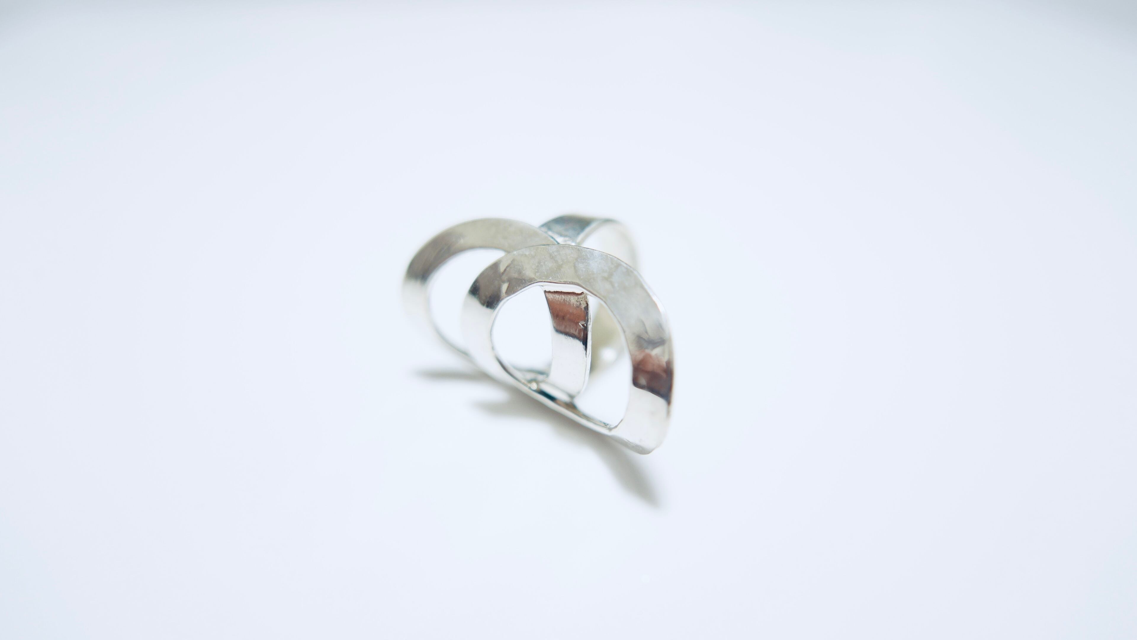 2つの楕円で構成されており、プレーン面と槌目模様の二面性を表現し光の当たり加減でシルバー色に濃淡が表れます。